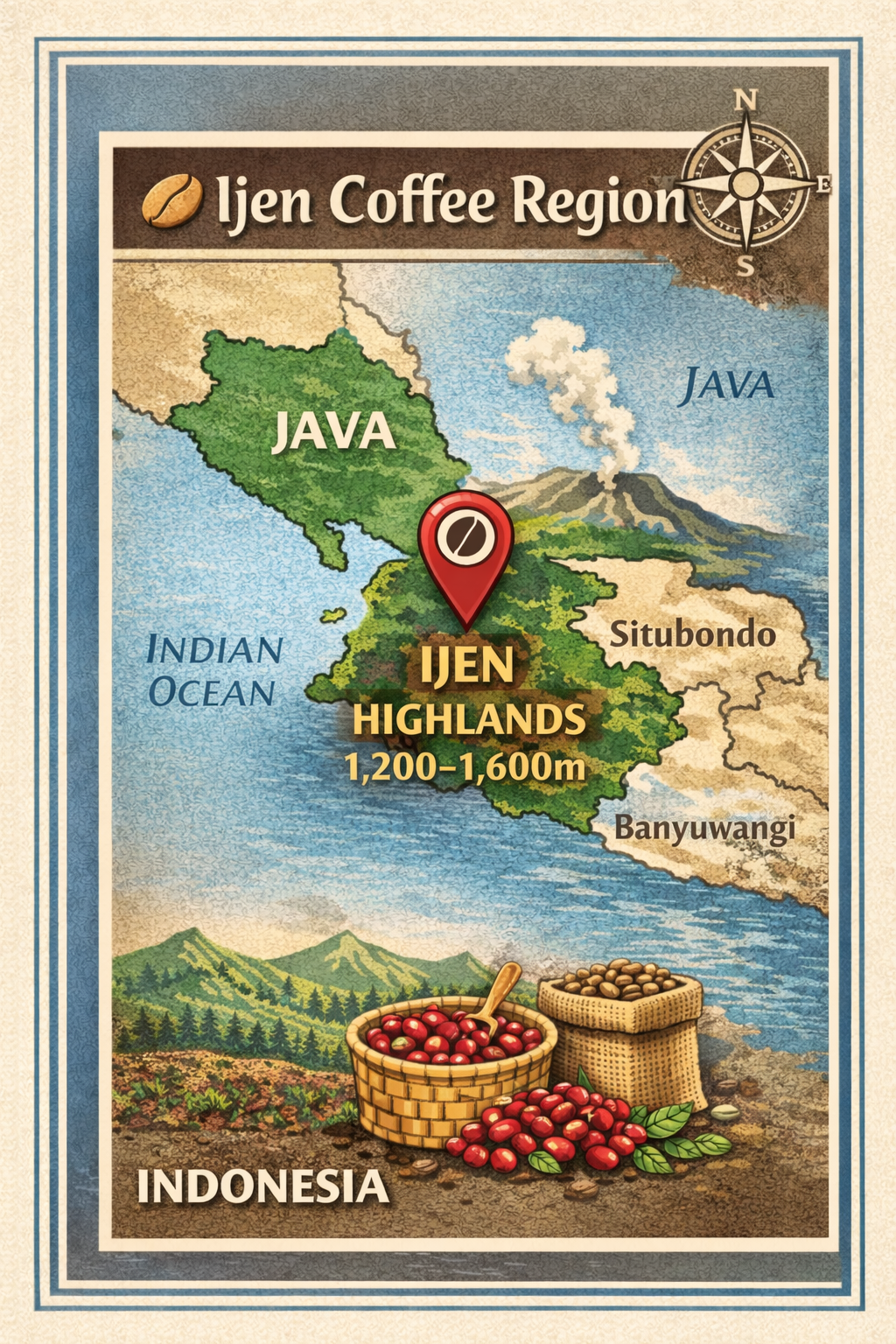 Cultivated on the Ijen Plateau in eastern Java, this coffee comes from large estates established by the Dutch in the 18th century. Grown at altitudes over 1,400 meters, the ripe cherries are quickly transported to mills for meticulous wet processing, resulting in a clean and consistent cup.