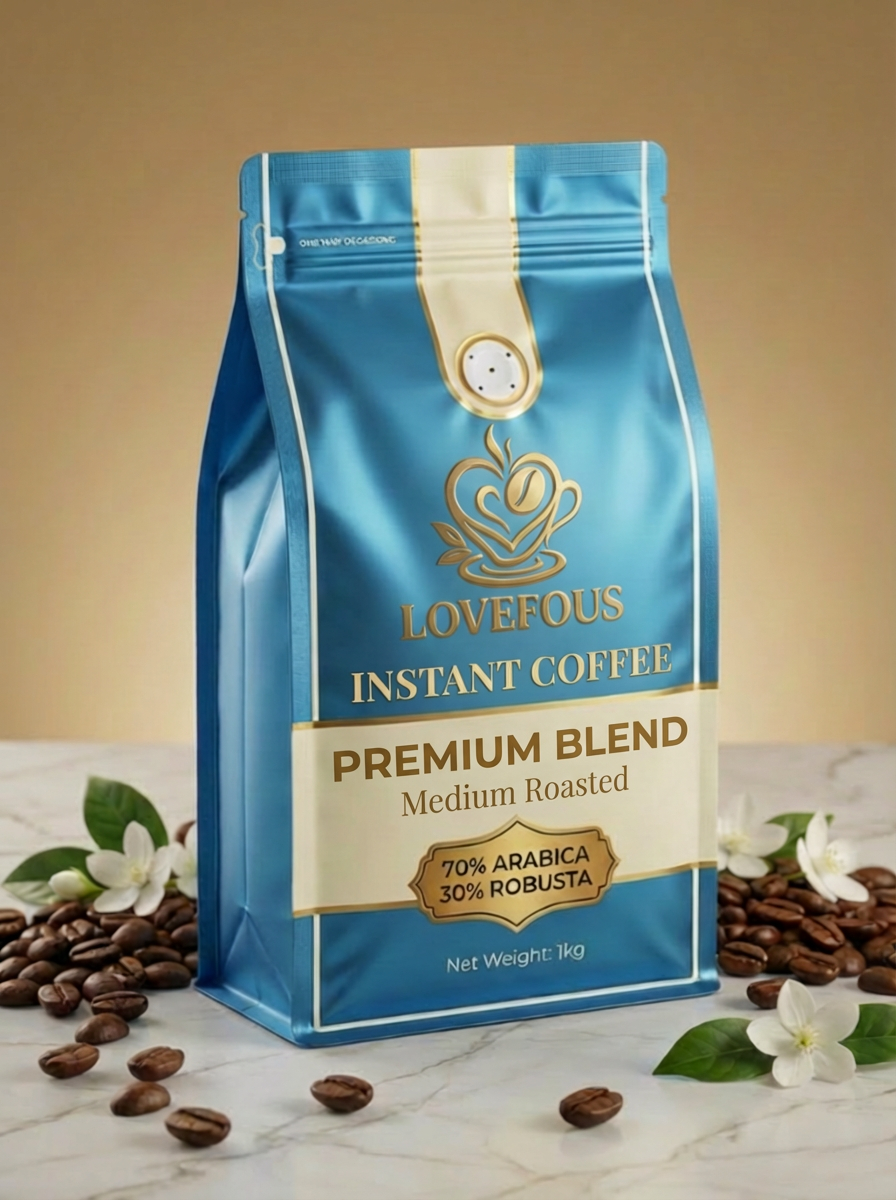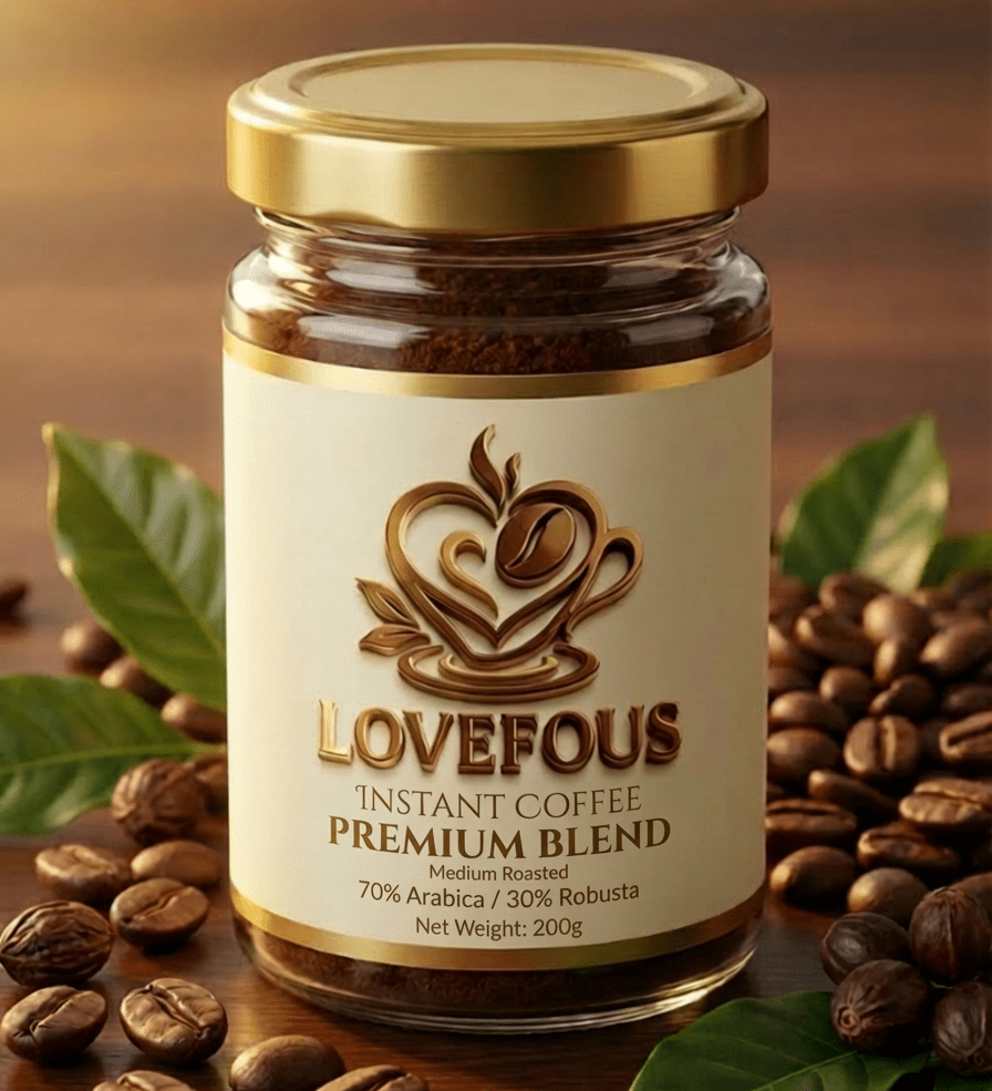 Instant Coffee 30/70 — a bold blend of Arabica and Robusta, freeze-dried to preserve aroma and deliver a rich, full-bodied cup with chocolatey notes and a long, satisfying finish.