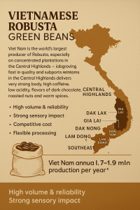 (You can phrase it simply in marketing materials as: “Viet Nam is the world’s number one Robusta producer and a key global supplier of high-quality Robusta green beans.”)