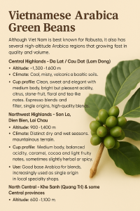 Although Viet Nam is best known for Robusta, it also has several high-altitude Arabica regions that are growing fast in quality and volume.